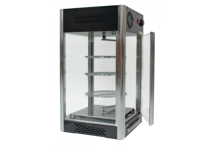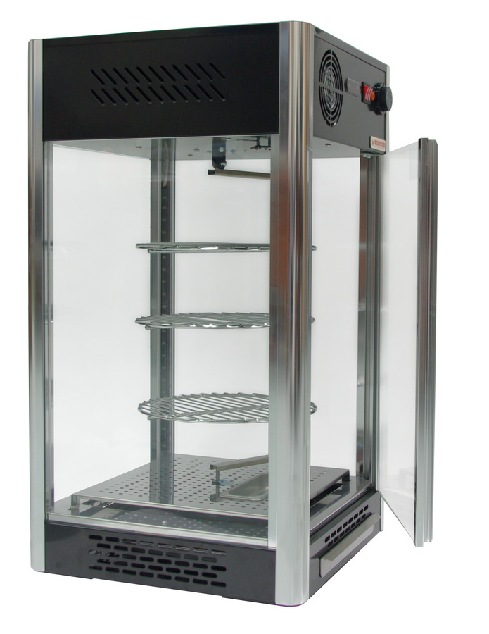 Витрина тепловая из нержавеющей стали с вращающимися полками.