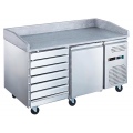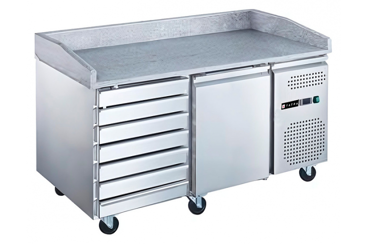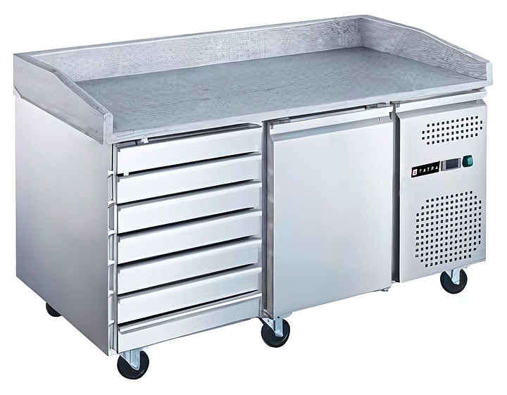 Стол Tatra TPZEN1D7 STB предназначен для приготовления пиццы на предприятиях общественного питания и торговли. Модель оснащена встроенным холодильным агрегатом с боковым расположением, цифровым термостатом, бортом с 3 сторон, самозакрывающейся глухой дверью с магнитным уплотнителем, 7 нейтральными ящиками и колесами, 2 из которых со стопорами. Корпус выполнен из высококачественной нержавеющей стали, столешница - из камня.