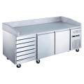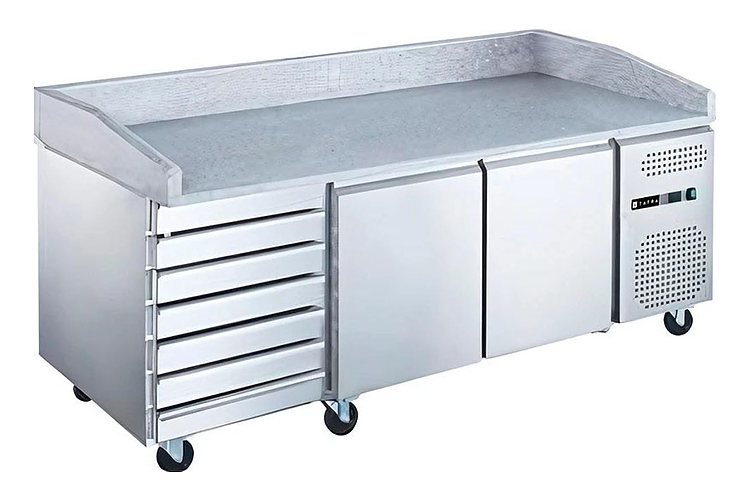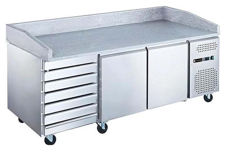 Стол Tatra TPZEN2D7 предназначен для приготовления пиццы на предприятиях общественного питания и торговли. Модель оснащена встроенным холодильным агрегатом с боковым расположением, цифровым термостатом, бортом с 3 сторон, 2 самозакрывающимися глухими дверьми с магнитным уплотнителем, 7 нейтральными ящиками и колесами, 2 из которых со стопорами. Корпус выполнен из высококачественной нержавеющей стали, столешница - из камня.