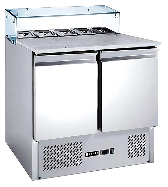 Стол Tatra TPZGNL2 VG ST предназначен для приготовления пиццы на предприятиях общественного питания и торговли. Модель оснащена встроенным холодильным агрегатом с нижним расположением, цифровым термостатом, 2 глухими дверьми с магнитным уплотнителем, отделением для гастроемкостей с козырьком и регулирумыми по высоте ножками. Корпус выполнен из высококачественной нержавеющей стали, столешница - из камня, козырек - из стекла.