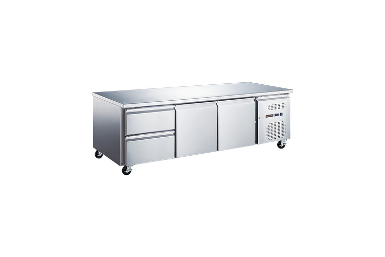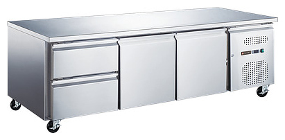 Холодильный стол Tatra TRTGN2D2 TN предназначен для хранения предварительно охлажденных мясных и рыбных полуфабрикатов, заготовок для салатов, молочной продукции, напитков, а также раскатки теста и обработки пищевых продуктов на предприятиях общественного питания и торговли. Модель оснащена встроенным компрессорным холодильным агрегатом с боковым расположением, электронным контроллером с цифровым дисплеем индикации на фронтальной панели, столешницей, холодильной камерой с 3 секциями: 1 – с 2 выдвижными ящиками и 2 – с распашной дверью в каждой. Корпус выполнен из высококачественной нержавеющей стали.