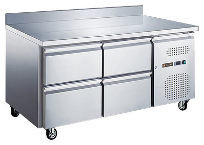 Холодильный стол Tatra TRTGND4 TN SB предназначен для хранения предварительно охлажденных мясных и рыбных полуфабрикатов, заготовок для салатов, молочной продукции, напитков, а также раскатки теста и обработки пищевых продуктов на предприятиях общественного питания и торговли. Модель оснащена встроенным компрессорным холодильным агрегатом с боковым расположением, электронным контроллером с цифровым дисплеем индикации на фронтальной панели, столешницей с задним бортом, холодильной камерой с 2 секциями, каждая секция оснащена 2 выдвижными ящиками. Корпус выполнен из высококачественной нержавеющей стали.