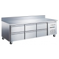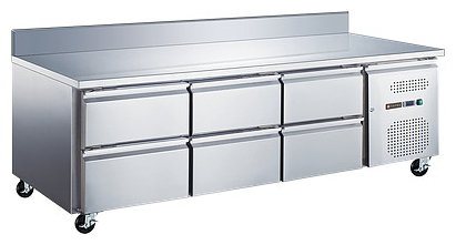 Холодильный стол Tatra TRTGND6 TN SB предназначен для хранения предварительно охлажденных мясных и рыбных полуфабрикатов, заготовок для салатов, молочной продукции, напитков, а также раскатки теста и обработки пищевых продуктов на предприятиях общественного питания и торговли. Модель оснащена встроенным компрессорным холодильным агрегатом с боковым расположением, электронным контроллером с цифровым дисплеем индикации на фронтальной панели, столешницей с задним бортом, холодильной камерой с 3 секциями, каждая секция оснащена 2 выдвижными ящиками. Корпус выполнен из высококачественной нержавеющей стали.