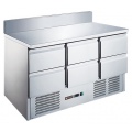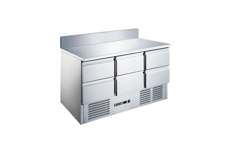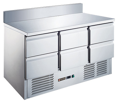 Холодильный стол Tatra TRTGNLD6 TN SB предназначен для хранения предварительно охлажденных мясных и рыбных полуфабрикатов, заготовок для салатов, молочной продукции, напитков, а также раскатки теста и обработки пищевых продуктов на предприятиях общественного питания и торговли. Модель оснащена встроенным компрессорным холодильным агрегатом с нижним расположением, расположенными в нижней части фронтальной стенки электронным контроллером с цифровым дисплеем индикации, столешницей с задним бортом, холодильной камерой с 3 секциями, каждая секция оснащена 2 выдвижными ящиками. Корпус выполнен из высококачественной нержавеющей стали.