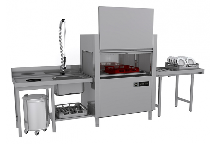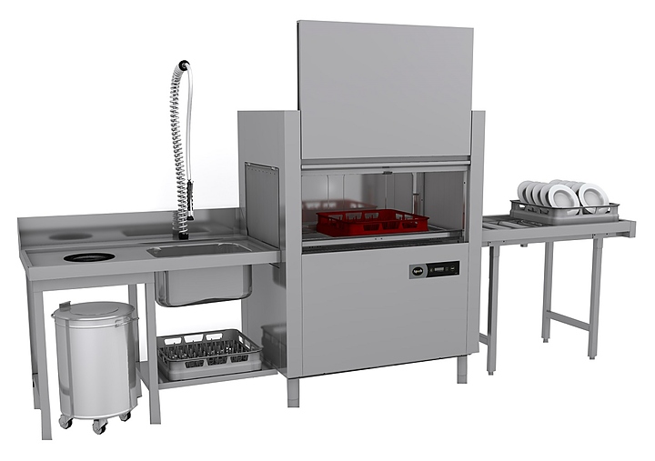 В комплект поставки входят дозаторы, подключение к холодной воде и модуль сушки. Столы для грязной и чистой посуды, накопитель пара и вентилятор вытяжки заказываются отдельно.
