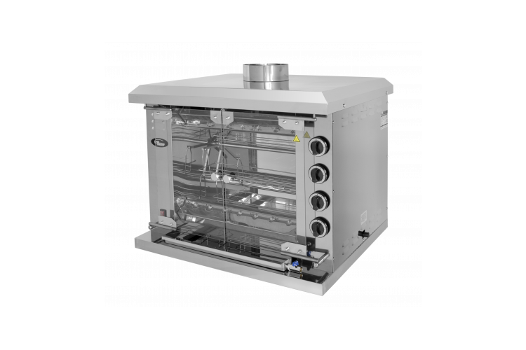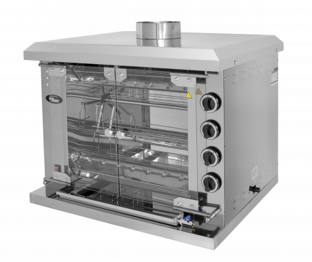 Гриль карусельный газовый на 20 тушек (масса тушки 1,2 кг), 5 люлек(корзин для курицы и субпродуктов, 4 горелки с системой газ-контроль,4 регулирующих крана, передние дверцы из закаленного стекла, задняя стенка - полностью из закаленного стекла, в камере подсветка, выполнен полностью из нержавеющей стали газовая мощность 13 кВт