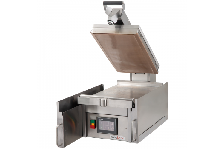 Гриль двусторонний прижимной, настольного исполнения с электронным управлением (touch panel). Панель дает возможность записать 6 независимых регулируемых таймера. Верхняя поверхность поднимается автоматически по срабатыванию таймера. Жарочные поверхности изготовлены из нержавеющей стали AISI430, размер жарочной поверхности 300х480мм. Корпус изготовлен из нерж. стали AISI430. Регулировка зазаора верхней жарочной поверхности 20мм. Тефлоновый коврик с креплением в комплекте. Два выдвижных лотка под жир по бокам делают уход и чистку максимально простой и удобной. Размер жарочной поверхности - 300х480мм, регулировка температуры - до 300*С Подключение к сети — вилка 2P+E 32А ( в комплект не входит)