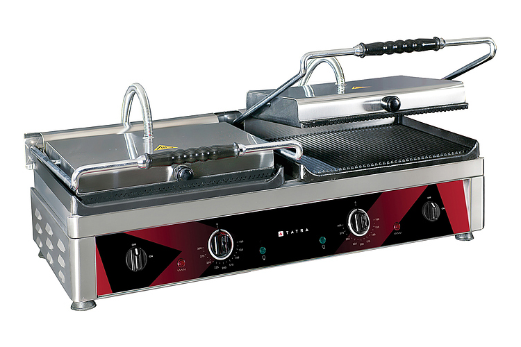 Прижимной гриль Tatra TCG 3627 RR RR предназначен для жарки мяса, птицы, рыбы, овощей и быстрого разогрева полуфабрикатов на предприятиях общественного питания и торговли. Модель оснащена электромеханической панелью управления с терморегулятором и индикаторами питания и нагрева и емкостью для сбора жира. Корпус выполнен из нержавеющей стали, жарочные поверхности - из чугуна.