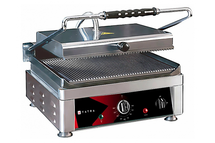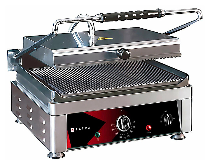 Прижимной гриль Tatra TCG 3627 RR предназначен для жарки мяса, птицы, рыбы, овощей и быстрого разогрева полуфабрикатов на предприятиях общественного питания и торговли. Модель оснащена электромеханической панелью управления с терморегулятором и индикаторами питания и нагрева и емкостью для сбора жира. Корпус выполнен из нержавеющей стали.
