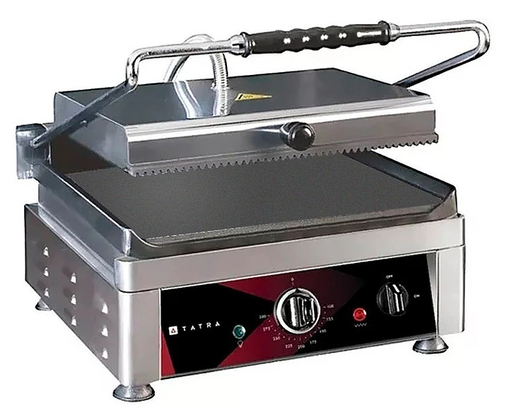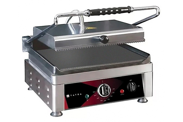 Прижимной гриль Tatra TCG 4527 RS предназначен для жарки мяса, птицы, рыбы, овощей и быстрого разогрева полуфабрикатов на предприятиях общественного питания и торговли. Модель оснащена электромеханической панелью управления с терморегулятором и индикаторами питания и нагрева и емкостью для сбора жира. Корпус выполнен из нержавеющей стали.