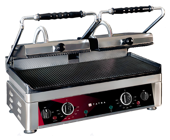 Прижимной гриль Tatra TCG 5224 R R R+R предназначен для жарки мяса, птицы, рыбы, овощей и быстрого разогрева полуфабрикатов на предприятиях общественного питания и торговли. Модель оснащена электромеханической панелью управления с терморегулятором и индикаторами питания и нагрева, системой независимого управления каждой зоной нагрева, 2 раздельными верхними поверхностями и емкостью для сбора жира. Корпус выполнен из нержавеющей стали.