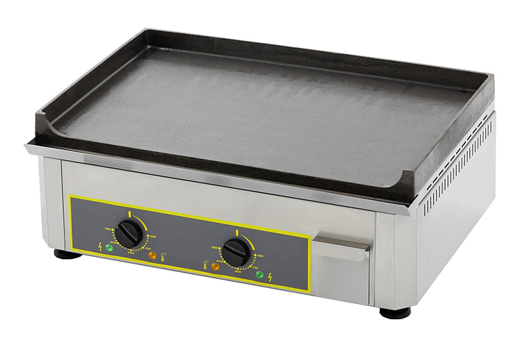 Гриль-сковорода PSF 600 E предназначен для жарки мяса, рыбы, овощей, сосисок, омлетов и других блюд. Жарочная поверхность гриля выполнена из чугуна, который обладает высокой степенью инерции и аккумулирует температуру, что позволяет готовить большее количество блюд при меньших затратах электроэнергии. Жарочная поверхность имеет две зоны с независимой регулировкой температур. Предварительный нагрев занимает не более 15 минут. Чистка производится шпателем. влажной губкой, а также с помощью деглазирования. Лишний сок и жир стекает через специальное отверстие в поддон, который отсоединяется и может мыться в посудомоечной машине. Термостат работает в температурном диапазоне от 0°С до +300°С, имеются сигнальные лампы. Работает от электросети.
