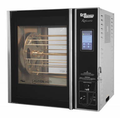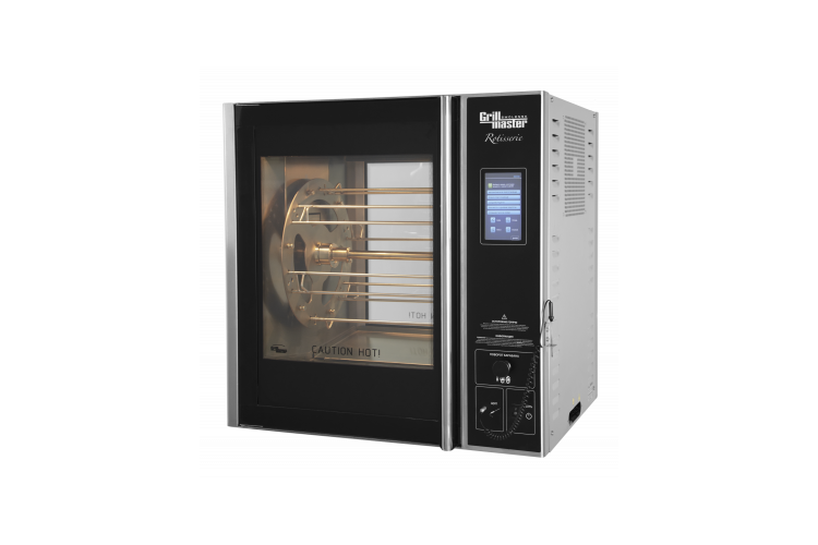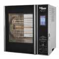 Гриль нового поколения, 6 спиц для одновременного приготовления 24 тушек до 2 кг, 6 корзин для кур и субпродуктов (опция), 6 угловых шампуров для кур (опция), возможно одновременное использование корзин и спиц для приготовления, мощный вентилятор конвекции, яркая галогенная подсветка камеры, 4 программируемых режима приготовления с 4 шагами программы, термощуп, электронная сенсорная панель управления с функцией программирования, сквозной доступ в камеру гриля (2 двери), стекла гриля с теплоотражающим покрытием, разборный барабан, полностью из н/стали c черным покрытием (на выбор клиента), 50-250°С, 8 кВт, 380 В, г. нетто 830х670х820 мм, 180 кг, г. брутто 990х870х1070 мм, 210 кг