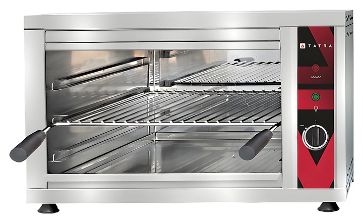 Гриль Salamander Tatra TSG 43 предназначен для обжаривания стейков и сосисок, приготовления сэндвичей, полуфабрикатов, подогрева булочек, гамбургеров, хот-догов и поддержания готовых блюд в разогретом состоянии на предприятиях общественного питания и торговли. Модель оснащена 1 зоной нагрева, регулятором мощности и съемным поддоном для сбора жира и крошек. Корпус выполнен из нержавеющей стали.