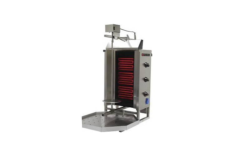 Гриль для шаурмы Tatra TDM E 3T M используется на предприятиях общественного питания и торговли для приготовления мясной начинки для шаурмы. Равномерное приготовление мяса происходит благодаря вращению заготовки вокруг своей оси около нагревательных элементов, по мере готовности прожаренный слой срезается электрическим или обычным ножом. Модель оснащена вертикально-ориентированным жарочным блоком с 3 трубчатыми нагревательными элементами и электромеханической панелью управления. Корпус выполнен из нержавеющей стали.