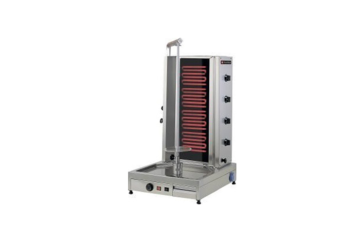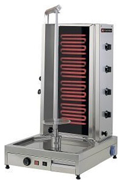 Гриль для шаурмы Tatra TDM E 4BW M используется на предприятиях общественного питания и торговли для приготовления мясной начинки для шаурмы. Равномерное приготовление мяса происходит благодаря вращению заготовки вокруг своей оси около нагревательных элементов, по мере готовности прожаренный слой срезается электрическим или обычным ножом. Модель оснащена вертикально-ориентированным жарочным блоком с 4 трубчатыми нагревательными элементами и электромеханической панелью управления. Корпус выполнен из нержавеющей стали.