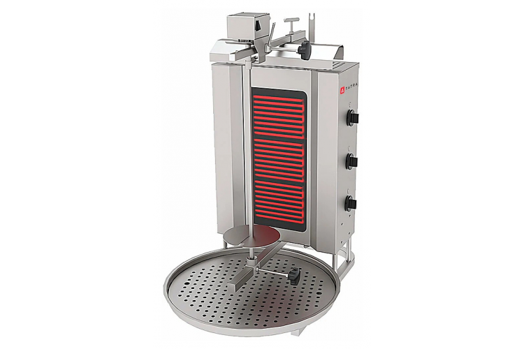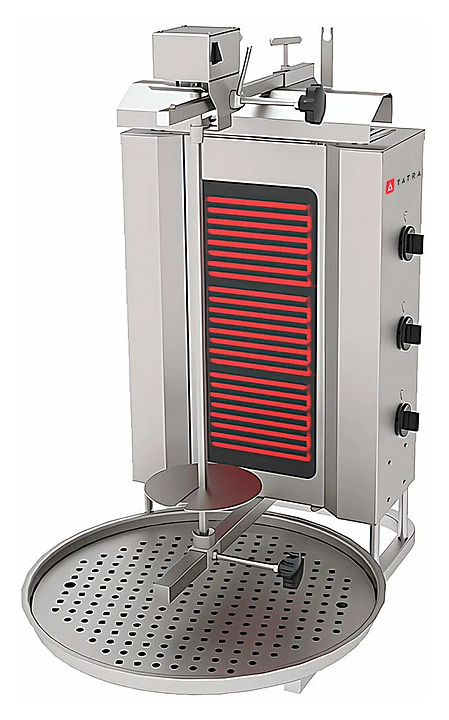 Гриль для шаурмы Tatra TDM E 3T предназначен для обжарки большого количества различных видов мяса и птицы при приготовлении начинки из рубленного мяса для шаурмы и других блюд на предприятиях общественного питания и торговли. Модель оснащена электромеханической панелью управления, верхним приводом вращения вертела и емкостью для сбора жира. Корпус выполнен из нержавеющей стали.
