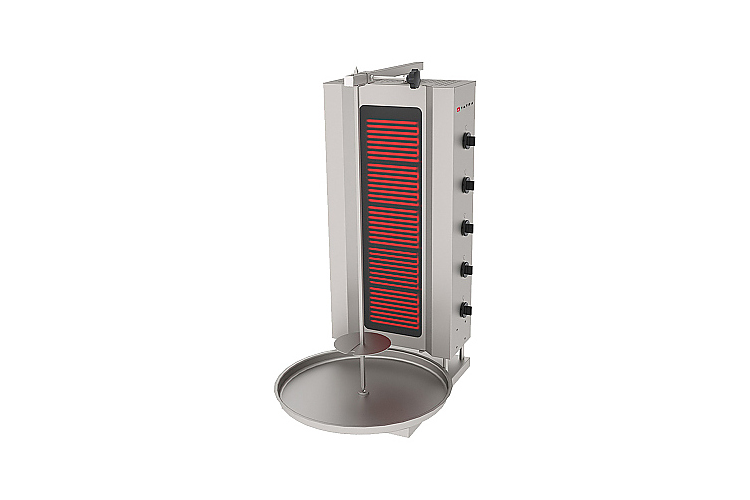 Гриль для шаурмы Tatra TDM E 5M предназначен для обжарки большого количества различных видов мяса и птицы при приготовлении начинки из рубленного мяса для шаурмы и других блюд на предприятиях общественного питания и торговли. Модель оснащена электромеханической панелью управления. Корпус выполнен из нержавеющей стали.