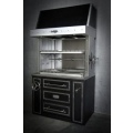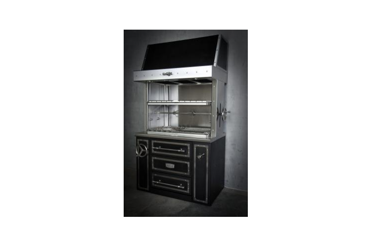 Обновленная и усовершенствованная модель гриль-мангала с увеличенным очагом из шамотного кирпича, с чугунными колосниками. Произведен полностью из высококачественной нержавеющей стали, покрыт специальной порошковой краской черного цвета в базовой версии, облицован молдингами из нержавеющей стали, оснащен яркой подсветкой, толщина столешницы гриля 3 мм(выполнена из нерж. стали), гриль-мангал укомплектован: 2 уровнями и 2 фермами для расположения решеток и шампуров; 2 решетки для жарки стейков/рыбы/шашлыка, центральный шампур из нержавеющей стали для жарки курицы, барашка, поросенка, кабана с электрическим и механическим приводом(литая поворотная ручка из нержавеющей стали), с плавной регулировкой шампура по вертикали, 10 шампуров для шашлыка, кочерга и совок для золы и углей, выдвижной отсек для золы и выдвижной инвентарный ящик, задний фартук гриля, регулируемая вытяжка, подходит для открытой и закрытой веранды, габаритные размеры нетто 1243х776х2228, масса 350 кг, габариты брутто 1350х1000х1840, масса брутто 373 кг