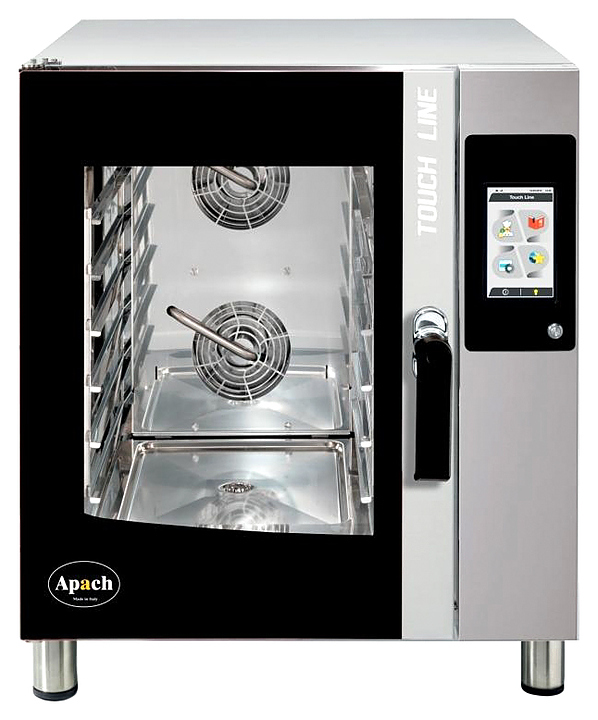 Пароконвектомат Apach AP7T предназначен для обжаривания, приготовления на пару, бланширования, запекания и других видов тепловой обработки продуктов на предприятиях общественного питания и торговли. Подсветка камеры осуществляется галогеновой лампой. Корпус и камера выполнены из нержавеющей стали.