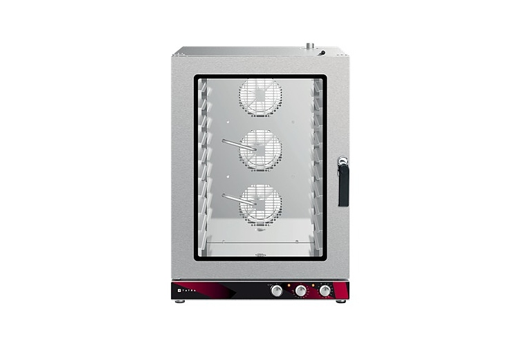 Пароконвектомат Tatra TB10M1L предназначен для обжаривания, приготовления на пару, бланширования, запекания и других видов тепловой обработки продуктов на предприятиях общественного питания и торговли. Модель оснащена электромеханической панелью управления и 3 реверсивными вентиляторами. Корпус и камера выполнены из нержавеющей стали, двойная дверь - из закаленного стекла.