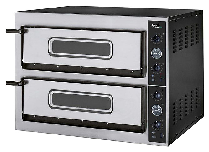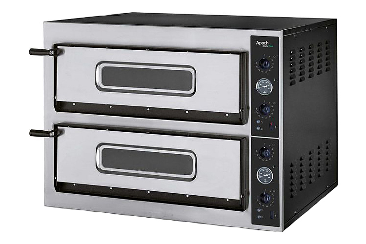 Печь для пиццы Apach AML44X серии используется на предприятиях общественного питания и торговли для выпеччки пиццы, гратинирования гастрономических продуктов и подогрева пищевых продуктов на противнях. Модель оснащена механической системой управления и 12 нагревательными элементами: 3 сверху и 3 снизу в каждой камере. Лицевая панель выполнена из нержавеющей стали, боковые и задние панели - из окрашенной стали, рабочая камера - из стали с алюминиевым покрытием, под - из огнеупорного камня сертифицированного для пищевых продуктов.