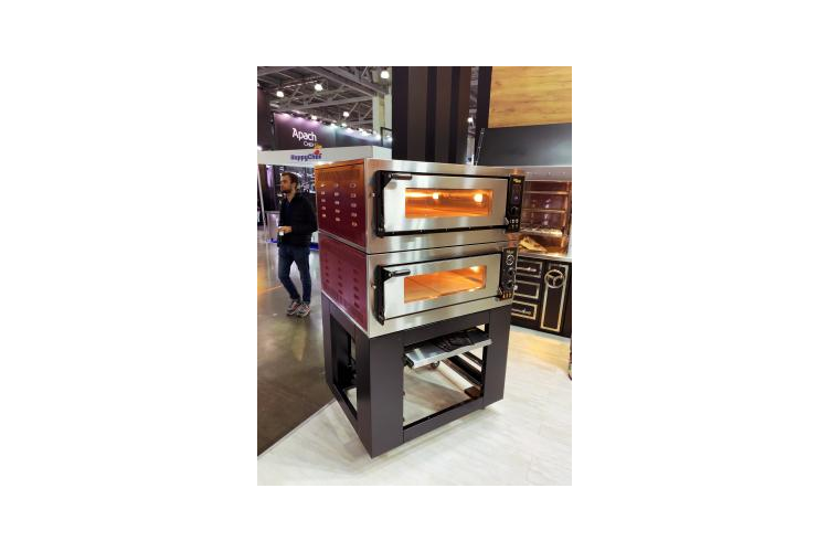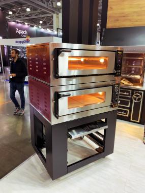 2 секции, установленные друг на друга, на 8 пицц до 350 мм в диаметре, 2 терморегулятора 50-500C в каждой секции, подсветка в камере, двери печей с большим смотровым стеклом, раздельное включение и регулировка верхних/нижних ТЭНов, печи укомплектованы стрелочными термометрами 0-500С, материал изготовления печей полностью из нержавеющей стали(камера и облицовка), каменный под печи имеет тощину 20 мм, что вместе с мощными ТЭНами позволяет выпекать пиццу в неаполитанском стиле при температуре более 450С, крыша и боковые стенки облицовки покрыты спец. покрытием вишневого цвета, размер камеры печи 720х720х140 мм, габариты нетто 1005х950х1664 мм, 85кг, 8.2 кВт, 380В, габариты нетто 1005х950х830 мм, 170 кг, 16,6 кВт, 380В, габариты брутто 1095х1060х930 мм, 190 кг
