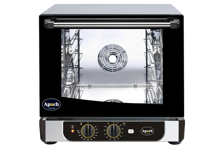 Конвекционная печь Apach AD44MH ECO предназначена для выпекания или разогрева кондитерских и хлебобулочных изделий, готовых блюд, замороженных или предварительно выдержанных в расстоечном шкафу заготовок из теста с применением режимов сочетания конвекции и пара на предприятиях общественного питания и торговли. Модель оснащена электромеханической панелью управления и подсветкой камеры галогеновой лампой. Корпус и камера печи изготовлены из нержавеющей стали, дверца - из двойного закаленного стекла.