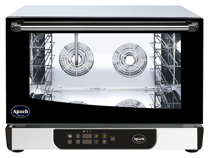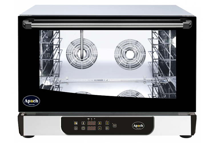Конвекционная печь Apach AD46D предназначена для выпекания или разогрева кондитерских и хлебобулочных изделий, готовых блюд, замороженных или предварительно выдержанных в расстоечном шкафу заготовок из теста на предприятиях общественного питания и торговли. Модель оснащена цифровой панелью управления и подсветкой камеры галогеновой лампой. Корпус и камера печи изготовлены из нержавеющей стали, дверца - из двойного закаленного стекла.