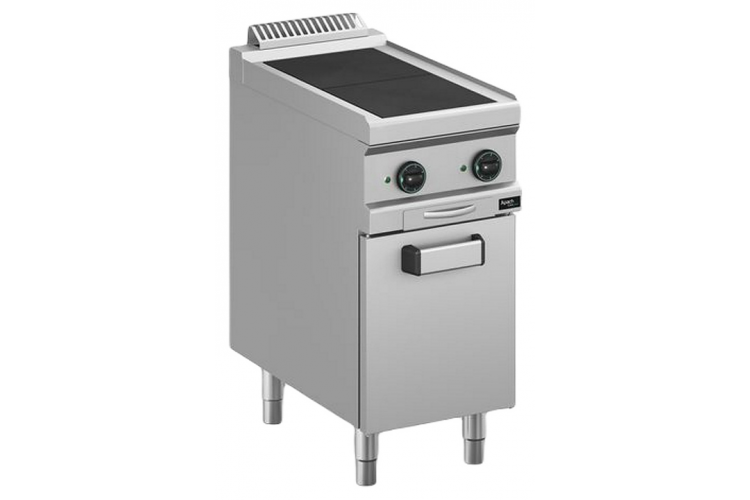 Электрическая плита Apach APRE-47QP 700-й серии предназначена для приготовления различных блюд из мяса, птицы, рыбы и овощей в наплитной посуде на предприятиях общественного питания и торговли. Модель оснащена электромеханической панелью управления, быстро нагревающимися конфорками, гидроизолированной прессованной поверхностью, выдвижным лотком для сбора остатков пищи, масла и жира и открытой подставкой с регулируемыми по высоте ножками. Корпус, рабочая поверхность, панель управления и вытяжная решетка выполнены из нержавеющей стали AISI 304, боковые и задняя панели - из нержавеющей стали AISI 430.