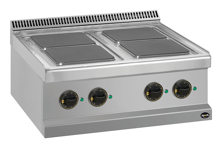 Электрическая плита Apach APRE-77T/PL 700-й серии предназначена для приготовления различных блюд из мяса, птицы, рыбы и овощей в наплитной посуде на предприятиях общественного питания и торговли. Модель оснащена электромеханической панелью управления, быстро нагревающимися конфорками и гидроизолированной прессованной поверхностью. Корпус, рабочая поверхность, панель управления и вытяжная решетка выполнены из нержавеющей стали AISI 304, боковые и задняя панели - из нержавеющей стали AISI 430.