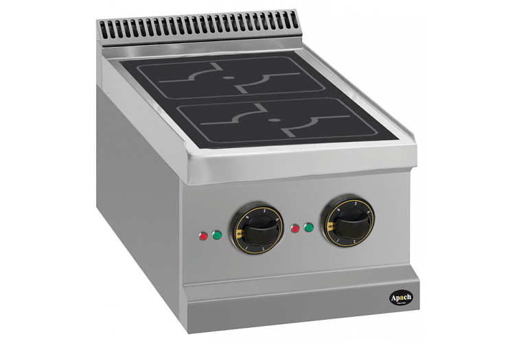 Индукционная плита Apach APRI-47T 700-й серии предназначена для приготовления различных блюд из мяса, птицы, рыбы и овощей в наплитной посуде на предприятиях общественного питания и торговли. Модель с герметично вмонтированными конфорками и 6 температурными режимами оснащена электромеханической панелью управления с 2 терморегуляторами и 4 световыми индикаторами. Корпус, рабочая поверхность, панель управления и вытяжная решетка выполнены из нержавеющей стали AISI 304, боковые и задняя панели - из нержавеющей стали AISI 430.
