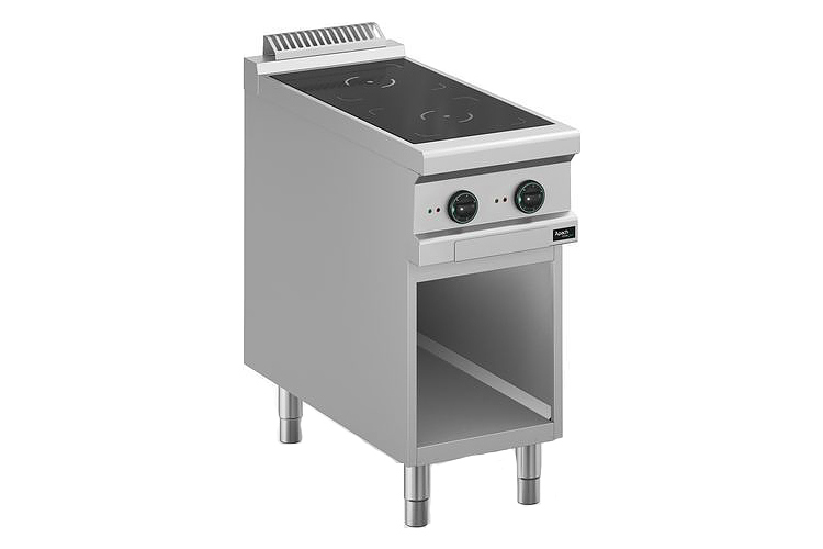 Индукционная плита Apach APRI-49P/PL 900-й серии предназначена для приготовления различных блюд из мяса, птицы, рыбы и овощей в наплитной посуде на предприятиях общественного питания и торговли. Модель с герметично вмонтированными конфорками и 6 температурными режимами оснащена открытой подставкой с регулируемыми по высоте ножками и электромеханической панелью управления с 2 терморегуляторами и 4 световыми индикаторами. Корпус, рабочая поверхность, панель управления и вытяжная решетка выполнены из нержавеющей стали AISI 304, боковые и задняя панели - из нержавеющей стали AISI 430.