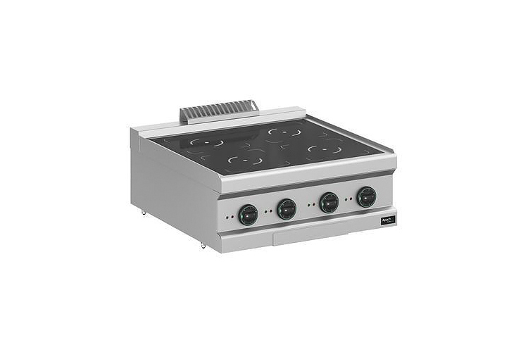Индукционная плита Apach APRI-77T/PL 700-й серии предназначена для приготовления различных блюд из мяса, птицы, рыбы и овощей в наплитной посуде на предприятиях общественного питания и торговли. Модель с герметично вмонтированными конфорками и 6 температурными режимами оснащена электромеханической панелью управления с 4 терморегуляторами. Корпус, рабочая поверхность, панель управления и вытяжная решетка выполнены из нержавеющей стали AISI 304, боковые и задняя панели - из нержавеющей стали AISI 430.