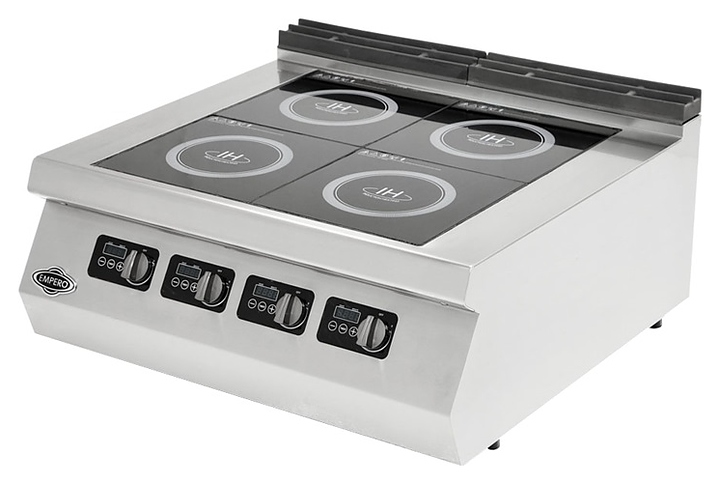 Настольная индукционная плита Empero EMP.PLS.7IND020 серии 700+ предназначена для приготовления большого ассортимента блюд на предприятиях пищевой промышленности, общественного питания и торговли. Принцип работы основан на непосредственном нагреве металлической посуды создаваемыми высокочастотным магнитным полем индуцированными вихревыми токами. Модель оснащена кабелем питания, рабочей поверхностью с 4 варочными зонами и расположенной на фронтальной наклонной стенке электромеханической панелью управления с 4 поворотными регуляторами, функциональными клавишами и 4 цифровыми дисплеями. Корпус выполнен из высококачественной нержавеющей стали, рабочая поверхность – из стекла черного цвета.