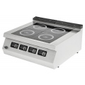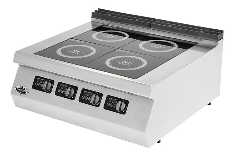 Настольная индукционная плита Empero EMP.PLS.9IND020 серии 900+ предназначена для приготовления большого ассортимента блюд на предприятиях пищевой промышленности, общественного питания и торговли. Принцип работы основан на непосредственном нагреве металлической посуды создаваемыми высокочастотным магнитным полем индуцированными вихревыми токами. Модель оснащена кабелем питания, рабочей поверхностью с 4 варочными зонами и расположенной на фронтальной наклонной стенке электромеханической панелью управления с 4 поворотными регуляторами, функциональными клавишами и 4 цифровыми дисплеями. Корпус выполнен из высококачественной нержавеющей стали, рабочая поверхность – из стекла черного цвета.
