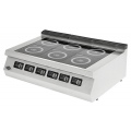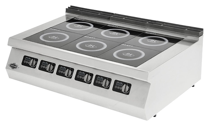 Настольная индукционная плита Empero EMP.PLS.9IND030 серии 900+ предназначена для приготовления большого ассортимента блюд на предприятиях пищевой промышленности, общественного питания и торговли. Принцип работы основан на непосредственном нагреве металлической посуды создаваемыми высокочастотным магнитным полем индуцированными вихревыми токами. Модель оснащена кабелем питания, рабочей поверхностью с 6 варочными зонами и расположенной на фронтальной наклонной стенке электромеханической панелью управления с 6 поворотными регуляторами, функциональными клавишами и 6 цифровыми дисплеями. Корпус выполнен из высококачественной нержавеющей стали, рабочая поверхность – из стекла черного цвета.