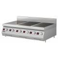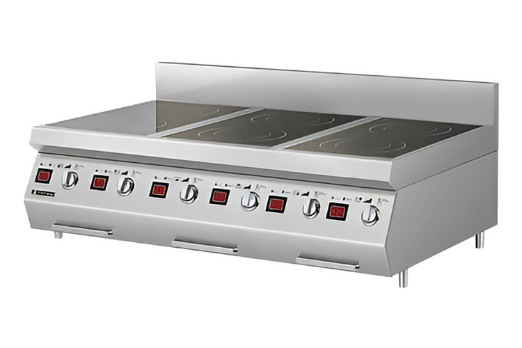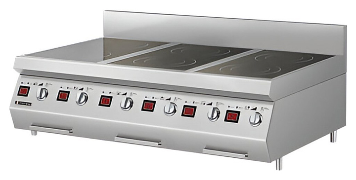 Настольная индукционная плита Tatra TIR.127M серии 700 предназначена для приготовления большого ассортимента блюд на предприятиях пищевой промышленности, общественного питания и торговли. Принцип работы основан на непосредственном нагреве металлической посуды создаваемыми высокочастотным магнитным полем индуцированными вихревыми токами. Модель оснащена 6 независимыми варочными зонами, кабелем питания, расположенной на наклонной фронтальной стенке электромеханической панелью управления панелью управления с 6 поворотными переключателями, 6 светодиодными цифровыми дисплеями с красной подсветкой индикации и опорными ножками. Корпус выполнен из высококачественной нержавеющей стали, рабочая поверхность – из стеклокерамики.