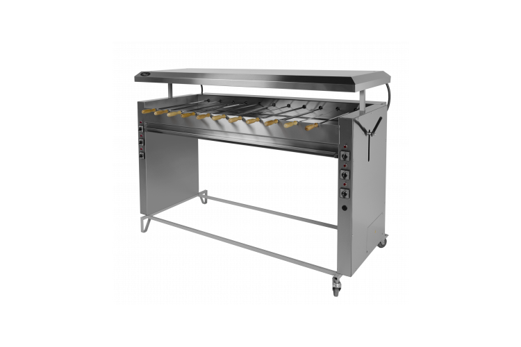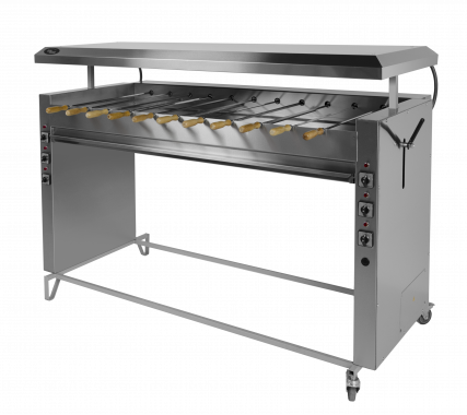11 шампуров, подъемная крыша, регулирующая уровень тепловой обработки продукта, автоматическое вращение шампуров, раздельное включение ТЭНов, колеса со стопорами, полностью из нержавеющей стали, 380В