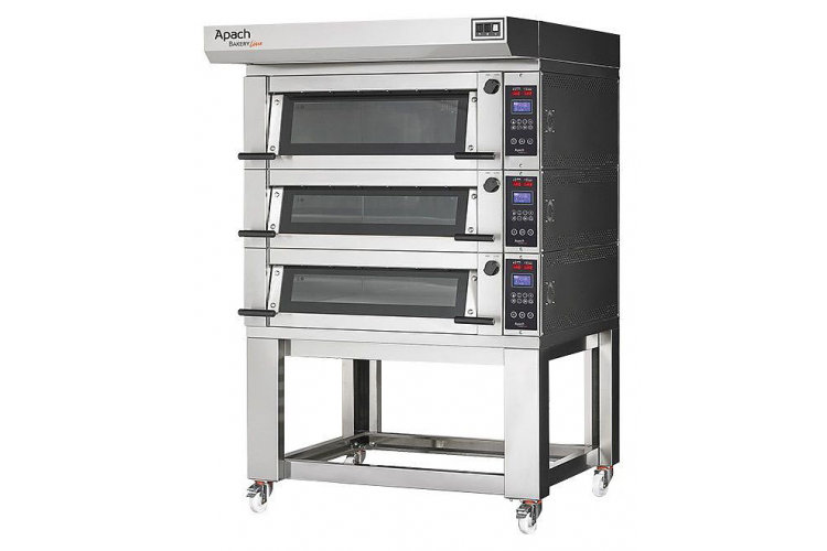 Подовая печь Apach Bakery Line E2LK4L DPBI-T используется на предприятиях пищевой промышленности, общественного питания и торговли, в пекарнях и кондитерских для приготовления различных блюд, выпечки хлебобулочных и кондитерских изделий. Модель оснащена цифровой панелью управления с раздельным контролем температур (верх/низ) и подставкой на колесах. Козырек, передняя и наружная части печи выполнены из нержавеющей стали, основание - из цементного агломерата с металлическим каркасом, дверь - из стекла, каркас основания - из металла, теплоизоляция - из минеральной ваты.