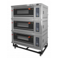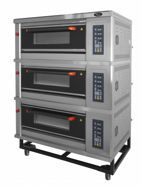 3 разборные секции на 6 пекарских противиней 600х400 с бойлерным пароувлажнением, прои-ть за 1 цикл выпечки - 72 буханки (форма Л7)/42 батона/30 багетов, большая рабочая камера, внутренние габариты каждой секции 870х680х185мм, выполненная полностью из нержавеющей стали. Электронная система розжига горелок с комплексной системой газ-контроль, 16 программируемых режимов работы, таймер каждой секции,режим отложенного запуска печи, раздельная регулировка температуры свода и пода печи, автоматическое поддержание температуры в пределах 40-300С, шибер каждой секции, яркая подсветка каждой секции, двери секций с большим двойным остеклением из закаленного стекла с подпружиненным возвратным механизмом закрытия. Для работы на природном и баллонном газе. Поставляется на колесах, оснащенными стопорами, газовая мощность 18 кВт + 9 кВт, 220 В, настроен на метан, габаритные размеры нетто 1388х1086х1747 мм, масса 375 кг, брутто 1478х1176х1960 мм, 400 кг