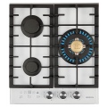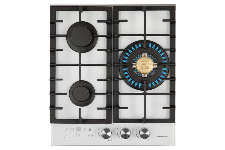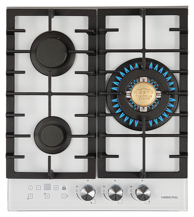 Газовая варочная панель Hiberg VM 4535 W предназначена для приготовления большого ассортимента блюд в домашних условиях. Модель оснащена 3 высококачественными конфорками различной мощности, 2 решетками, кабелем питания и фронтальной электромеханической панелью управления с 3 поворотными переключателями, сенсорной клавиатурой и светодиодным цифровым дисплеем с красной подсветкой индикации. Корпус выполнен из стали, рабочая поверхность – из высококачественного закаленного стекла белого цвета, решетки – из чугуна с черной поверхностью, цилиндрические ручки переключатей – из металла с серебристой поверхностью, фигурные ручки переключателей – из металла с поверхностью бронзового оттенка на белом основании.