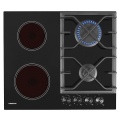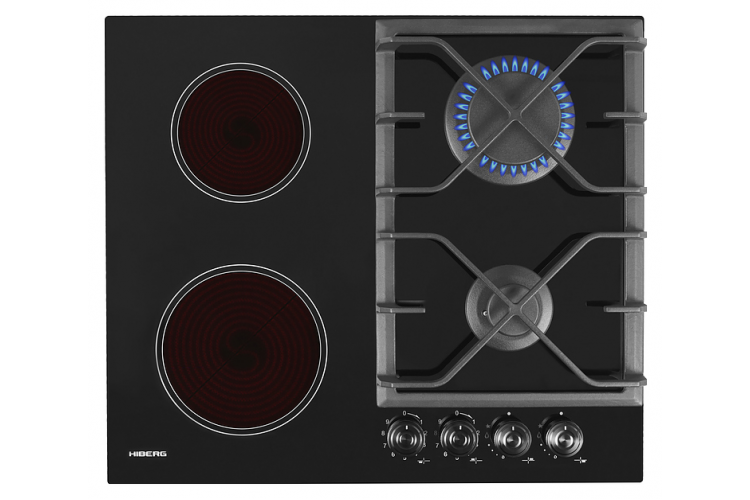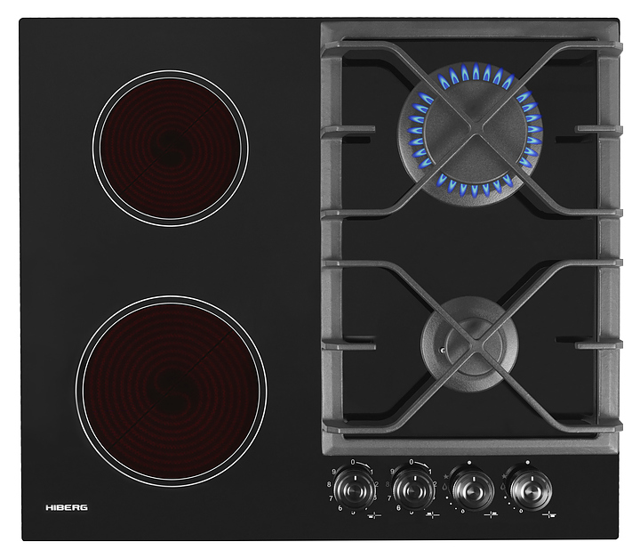 Комбинированная варочная панель Hiberg VM 6020 B предназначена для приготовления большого ассортимента блюд в в домашних условиях. Модель оснащена кабелем питания, 4 варочными зонами различной мощности: 2 газовыми и 2 электрическими, решеткой и фронтально расположенной панелью управления с 4 поворотными переключателями. Рабочая поверхность выполнена из высококачественной стеклокерамики черного цвета, решетка – из чугуна с черной поверхностью, цилиндрические ручки переключатей – из металла с черной рельефной поверхностью, фигурные ручки переключателей – из металла с поверхностью бронзового оттенка на черном основании.