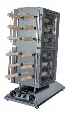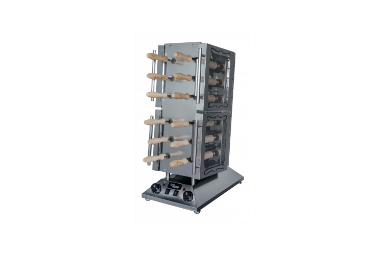 производительность 12 трдельников (калачей), 2 камеры, двери с жаропрочными стеклами, 2 термостата на 50-300 С, раздельное включение камер, 12 валиков в комплекте 6 ТЭНов, г.нетто 314х630х877, 40 кг, г.брутто 414х730х1027, 55кг