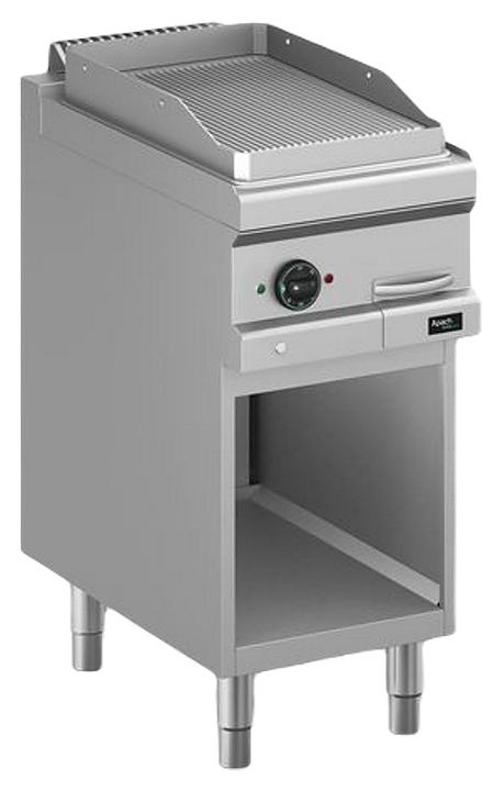 Жарочная поверхность Apach APTE-47PR/PL 700-й серии предназначена для обжарки мяса, рыбы и овощей на предприятиях общественного питания и торговли. Модель с закругленными краями и бортами оснащена электромеханической панелью управления с терморегулятором и 2 световыми индикаторами, выдвижным лотком для сбора остатков пищи, масла и жира и открытой подставкой с регулируемыми по высоте ножками. Корпус, панель управления и вытяжная решетка выполнены из нержавеющей стали AISI 304, боковые и задняя панели - из нержавеющей стали AISI 430, лоток - из нержавеющей стали, рабочая поверхность – из конструкционной стали.