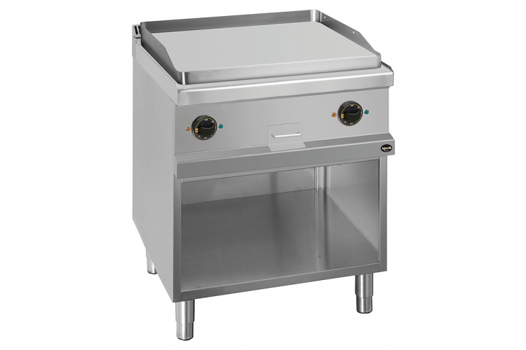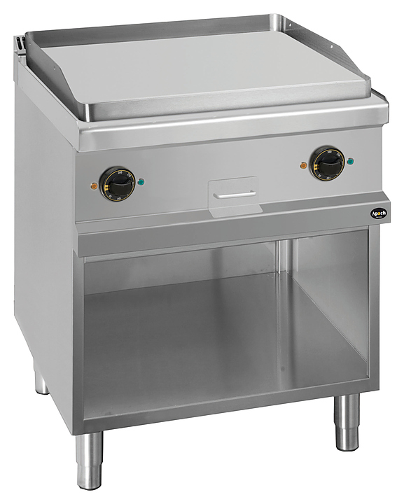 Жарочная поверхность Apach APTE-77PLC/PL 700-й серии предназначена для обжарки мяса, рыбы и овощей на предприятиях общественного питания и торговли. Модель с закругленными краями и бортами оснащена электромеханической панелью управления с 2 терморегуляторами и 4 световыми индикаторами, выдвижным лотком для сбора остатков пищи, масла и жира и открытой подставкой с регулируемыми по высоте ножками. Корпус, панель управления и вытяжная решетка выполнены из нержавеющей стали AISI 304, рабочая поверхность - из хромированной конструкционной стали, боковые и задняя панели - из нержавеющей стали AISI 430, лоток - из нержавеющей стали.