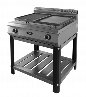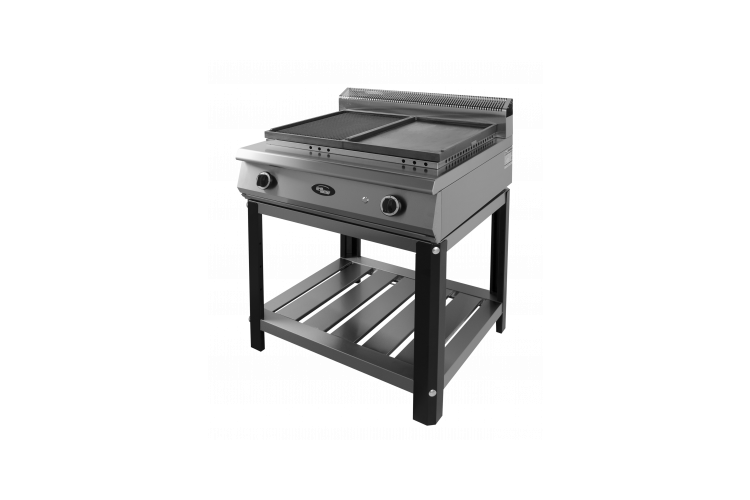 2 специальные горелки с запальной системой розжига, чугунная рабочая поверхность 720х1120, 1/2 рифленая, 1/2 гладкая, электророзжиг, газ/контроль,настроена на метан (сопло на пропан в комплекте), корпус из нержавеющей стали, г.нетто 800x800x1050, 94 кг, г.брутто:860х860х610, 99 кг., расход газа: сжиж. 1,92 кг/ч / прир. 2,544 м3/ч, мощность 24 кВт