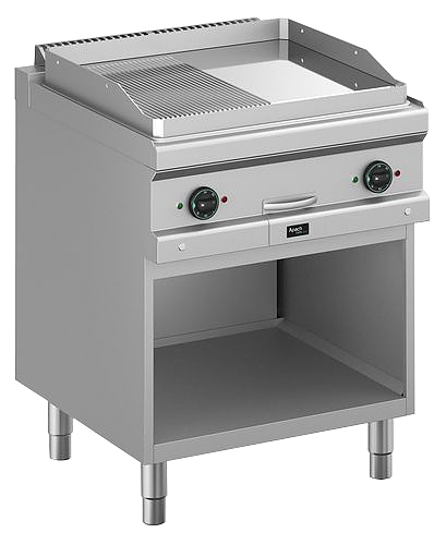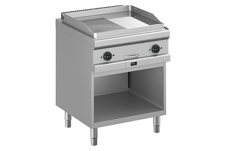 Открытая газовая сковорода Apach APTG-77PLRC/PL 700-й серии предназначена для обжарки мяса, рыбы и овощей на предприятиях общественного питания и торговли. Модель оснащена закругленными краями и бортами, термостатическим контролем температуры, емкостью для сбора жира, подставкой для хранения инвентаря и регулируемыми ножками. Нагреваемая поверхность с небольшим наклоном имеет 2 зоны: гладкую и рифленую. Сковороду можно использовать самостоятельно или в составе технологической линии. Столешница и защитный бортик выполнены из нержавеющей стали, жарочная поверхность - из хромированной стали.