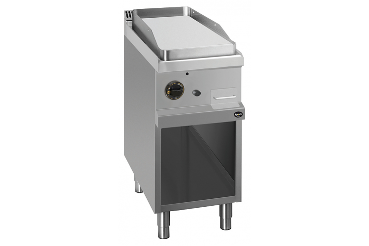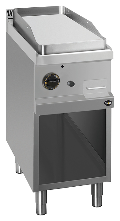 Открытая газовая сковорода Apach APTG-47PL/PL 700-й серии предназначена для обжарки мяса, рыбы и овощей на предприятиях общественного питания и торговли. Модель с закругленными краями и бортами оснащена электромеханической панелью управления с терморегулятором, горелкой с пьезоэлектрическим поджигом и системой стабилизации пламени, выдвижным лотком для сбора остатков пищи, масла и жира и открытой подставкой с регулируемыми по высоте ножками.