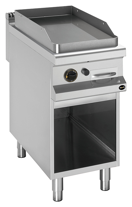 Открытая газовая сковорода Apach APTG-49PL/PL 900-й серии предназначена для обжарки мяса, рыбы и овощей на предприятиях общественного питания и торговли. Модель с закругленными краями и бортами оснащена электромеханической панелью управления с терморегулятором, горелкой с пьезоэлектрическим поджигом и системой стабилизации пламени, выдвижным лотком для сбора остатков пищи, масла и жира и открытой подставкой с регулируемыми по высоте ножками.